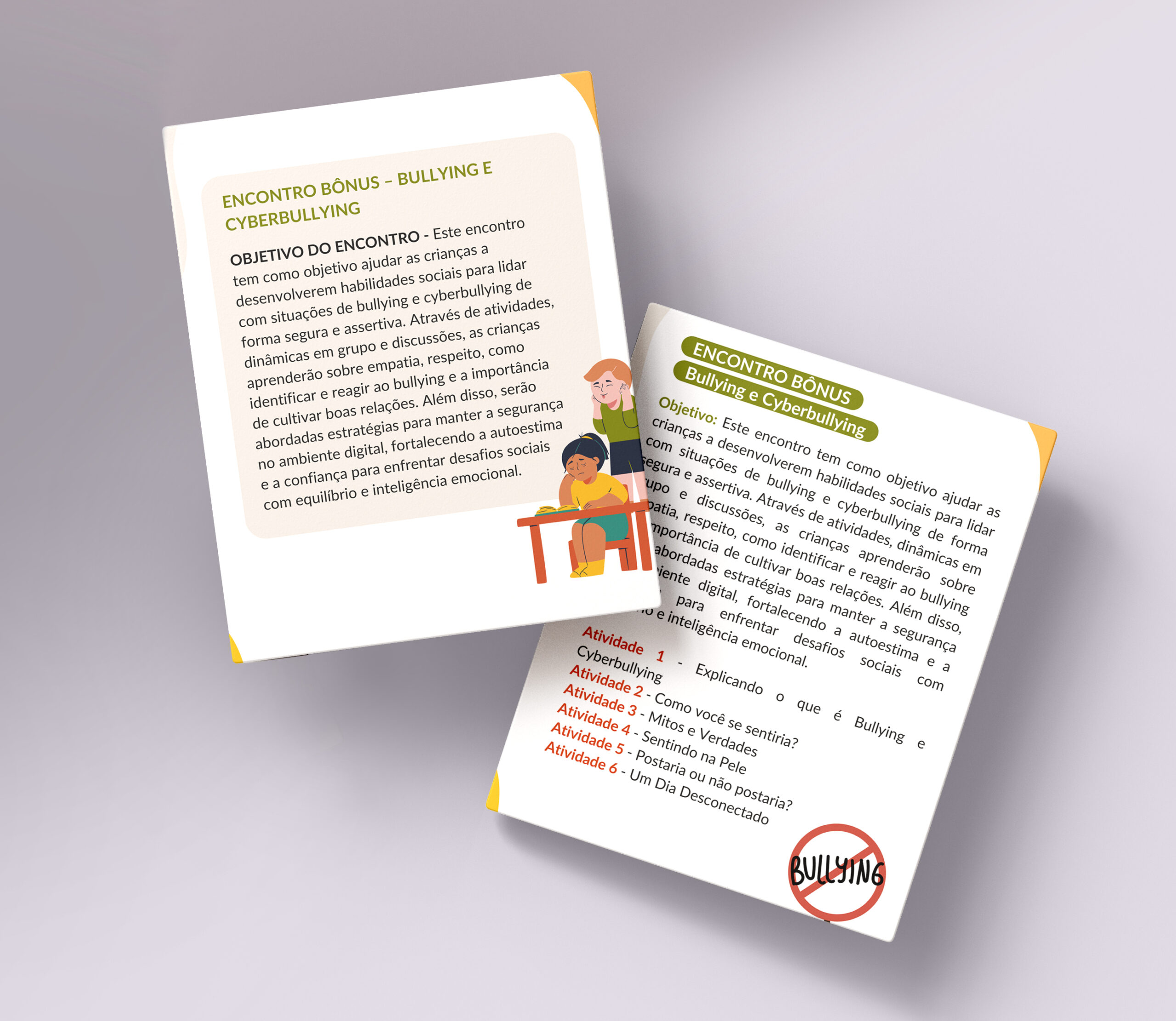 Além dos 8 encontros você ainda terá um encontro extra para trabalhar Bullying e Cyberbullying com crianças e levar para escolas ou fazer uma oficina com este tema!